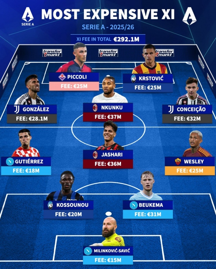 9月5日德国转会市场公布意甲今夏最昂贵引援阵容,恩昆库、亚沙里与小孔塞桑均入选榜单。